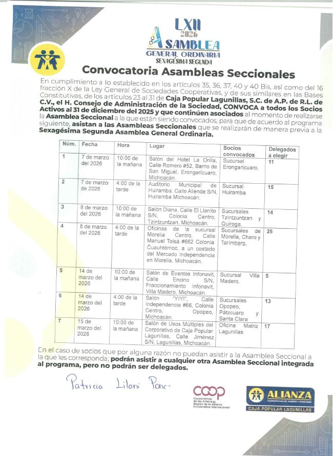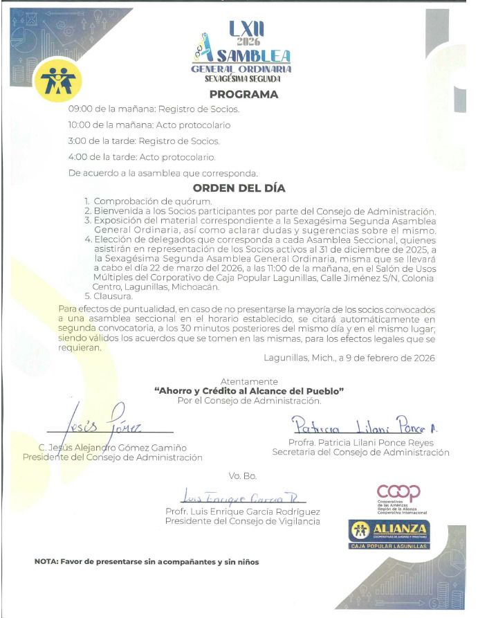 Estimados Socios de Alianza Caja Popular Lagunillas, esta es una atenta invitación del Honorable Consejo de Administración de nuestra Cooperativa para que los socios afiliados antes del 31 de diciembre de 2025, acudan a las Asambleas Seccionales de la sucursal que les corresponde, juntas que se celebrarán del 7 al 15 de Marzo de 2026.